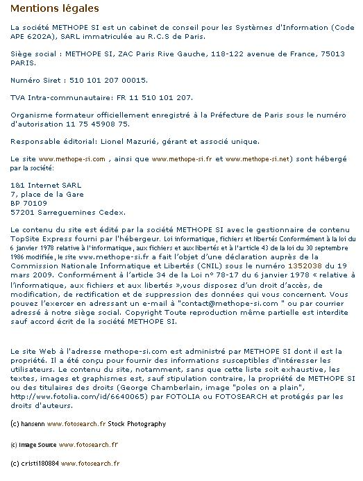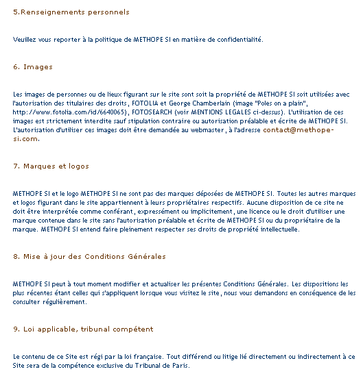 Copyright © 2009, METHOPE SI. Tous droits réservés. Toutes les marques auxquelles il est fait référence sur ce site sont détenues par leurs propriétaires respectifs. L'accès au site et son utilisation sont assujettis aux Conditions Générales ci-dessous, ainsi qu'à toutes les lois en vigueur. En accédant à ce site et en le parcourant, l'utilisateur accepte sans aucune restriction ni réserve ces Conditions Générales qui annulent et remplacent tous accords préalables passés avec METHOPE SI.